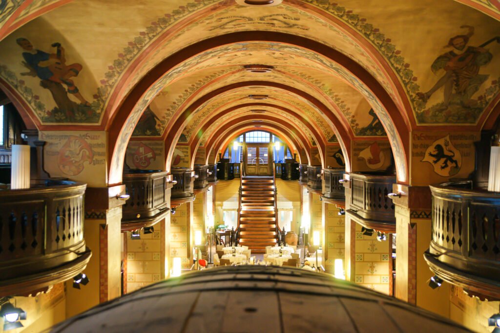 Beim Betreten des Kellers wird man von einer fast schon sakralen Atmosphäre empfangen. Die gewaltigen Dimensionen und die Aufteilung in drei Schiffe erinnern stark an die Architektur einer Kirche, was durch die prachtvollen Fresken und Deckenmalereien noch unterstrichen wird. Nach einer Zwischennutzung als Gewerbemuseum Ende des 19. Jahrhunderts wurde das Gebäude in den 1990er-Jahren umfassend und liebevoll saniert. Seit der Wiedereröffnung im Jahr 1998 erstrahlt es nun als einzigartiges Kultur- und Gastronomiezentrum, das barocke Pracht mit moderner Genusskultur vereint.