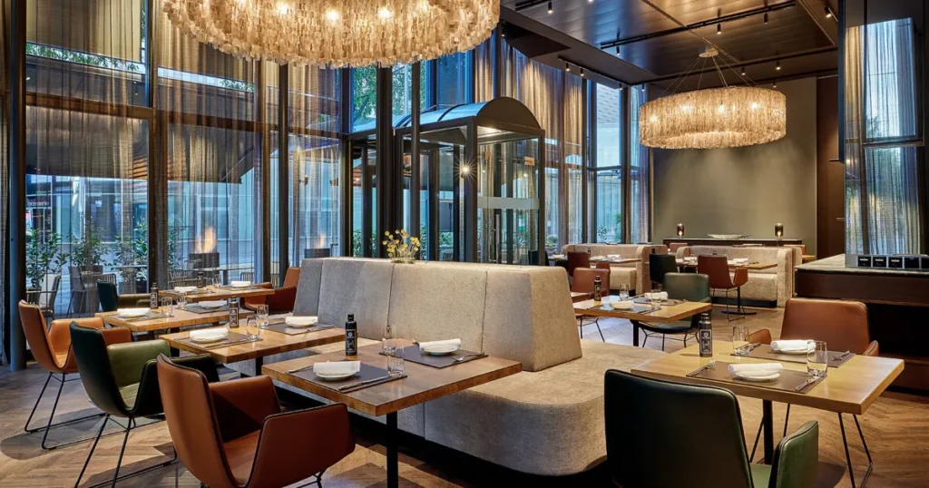 Das Ambiente des Restaurants ist modern, elegant und zugleich einladend. Klare Linien, warme Lichtakzente und ein hochwertiges Interieur schaffen eine exklusive, aber entspannte Atmosphäre.