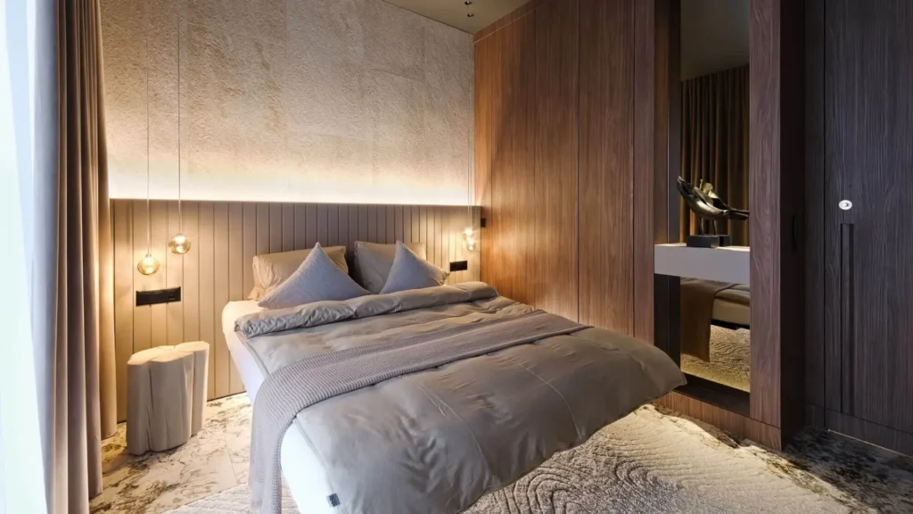 • Master Suite mit elegantem Doppelbett und direktem Gartenzugang